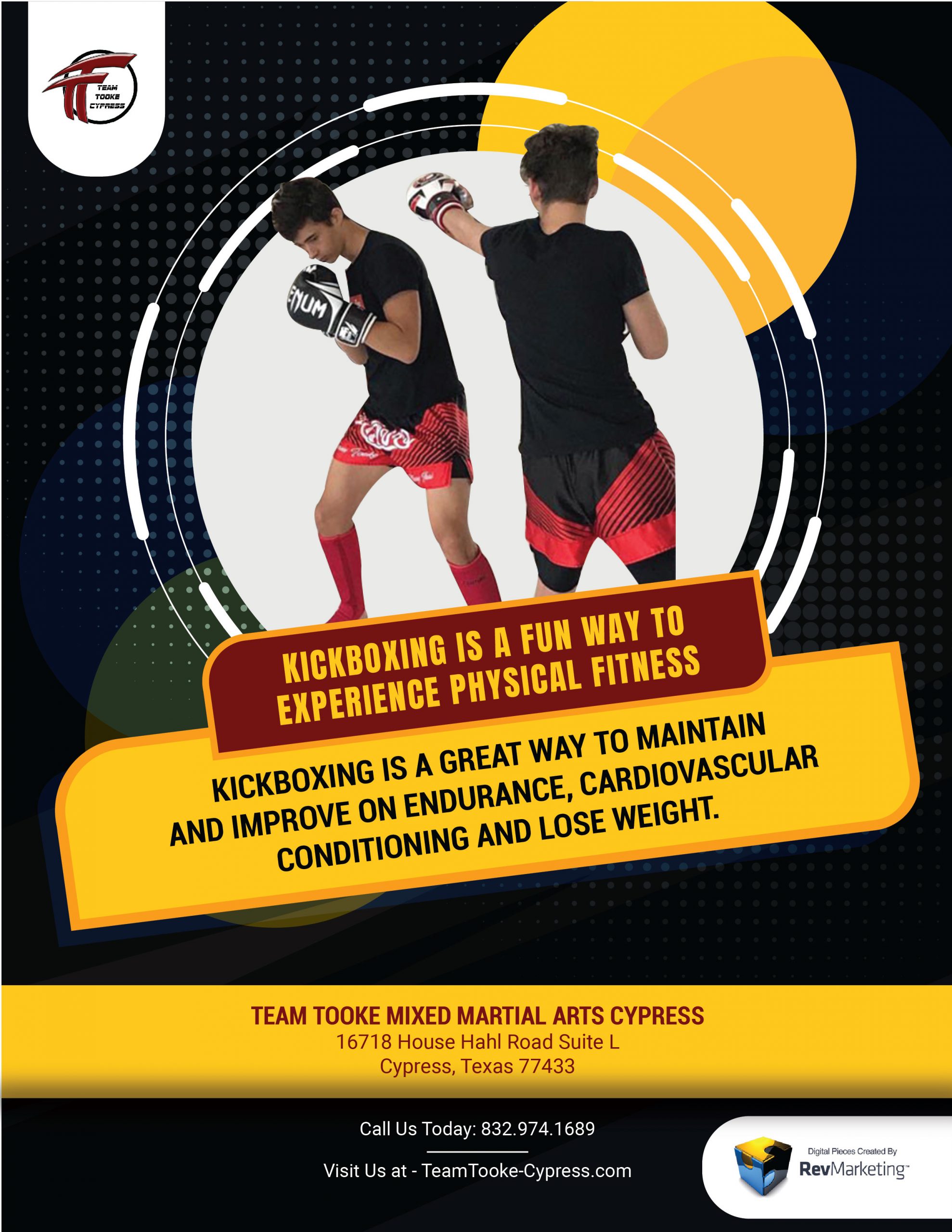 KICKBOXING IS A GREAT WAY TO MAINTAIN AND IMPROVE ENDURANCE, CARDIOVASCULAR CONDITIONING AND LOSE WEIGHT. LEARN MORE TODAY BY CALLING 832-974-1689.